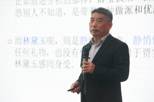 陈老师以小说第三十四回为例,结合文本,以理解品味作品文字为主要途径,带领大家通过分析相关人物描写以更好把握不同的人物形象。第三十四回主要讲的是贾宝玉被贾政“笞挞”后的相关情景。围绕贾宝玉挨打受伤,一是薛宝钗、林黛玉、王熙凤等人的“探病”,二是王夫人与袭人之间的“探心”,三是贾宝玉和林黛玉之间的“探情”,四是薛家母子三人关于贾宝玉挨打一事的“探因”,不同身份的人物表现各有不同。比如薛宝钗与林黛玉,同是来“探病”,区别却很大:动作、言语一个“多”一个“少”,作风一个“高调”一个“内敛”,行事一个“张扬”一个“含蓄”,二人的个性在细节描写中得到淋漓尽致的体现。